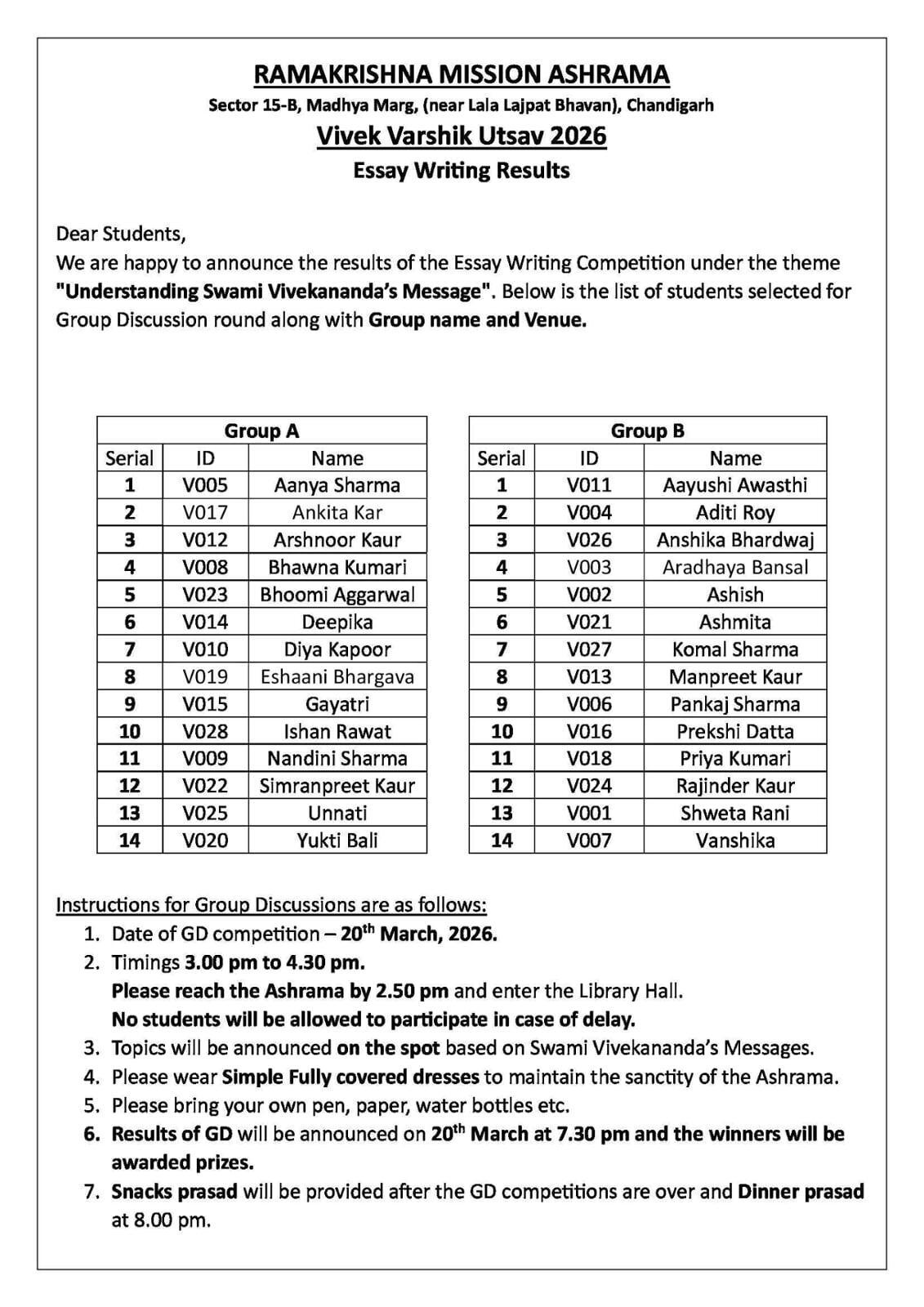 The Vivek Varshik Utsav on the occasion of Annual Celebrations - Swami Vivekananda Day will be held on Friday, 20th March, 2026 at 3.00 pm at Ramakrishna Mission Ashrama, Sector 15-B, Madhya Marg, Chandigarh.