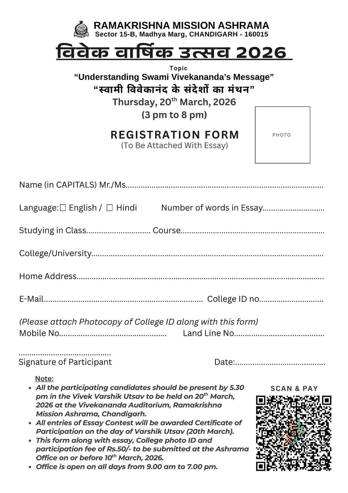 The Participation Form needs to be filled, passport size photo to be affixed, and submitted along with the essay (in 1500 to 2000 words) at the Ashrama office (open 9.00 am to 7.00 pm, all days), along with photocopy of College ID and participation fee of Rs. 50/- (by cash), on or before 10th March, 2026.